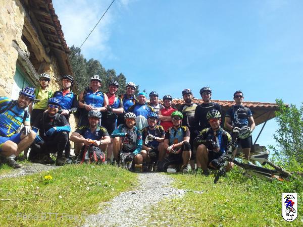 costero (uno de los incentivos de la ruta) he llegado al mirador del Fito.Una grata sorpresa nos espera a todos nosotros en el aparcamiento de las antenas, donde el patricio Rubén nos ofrece vituallas, sombra, ánimos, masajes … ¿masajes? y se prepara para tomar unas espectaculares y nada posadas fotos de nuestro paso con los Picos de fondo; espectacular entorno y excepcional fotógrafo, que dan como resultado unas pedazo fotazas de “pelayos en acción”. Me informa el Asturpelayo (que suena mejor que Pelasturcón) que burla burlando van los tres delante, Antonio, Pachu y Ángel, éstos dos últimos obligados a tomar el “atajo” por carretera. Tiro monte abajo por la tercera, última y más peligrosa de las bajadas, con breves paradas para desentumecer los brazos del efecto vibropower.